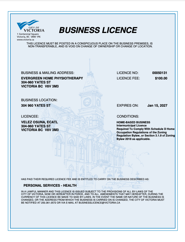 Evergreen Home Physiotherapy is fully licensed to deliver care in Greater VictoriaBusiness number: FM1091627